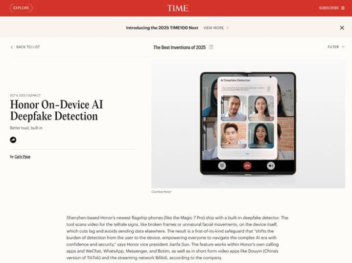 对于“端侧AI换脸检测技术”,《时代周刊》称其为AI时代安全防护的重要创新。荣耀最新旗舰手机(如Magic7Pro)配备AI反诈检测功能,可在端侧检测视频,查找画面不连贯、面部动作不自然等深度伪造迹象,既减少延迟,又避免数据外发。“这一首创防护措施,帮助用户利用手中的设备识别风险,使人们在复杂AI时代更有信心且安全地生活。”荣耀MagicOS总裁孙建发表示。