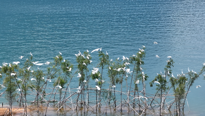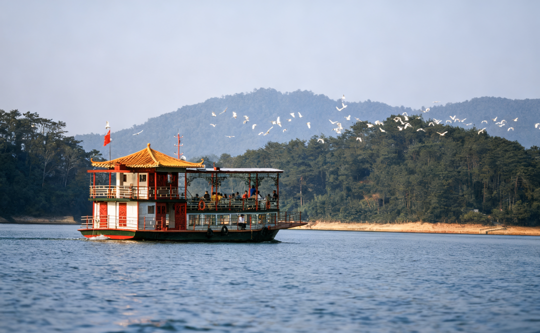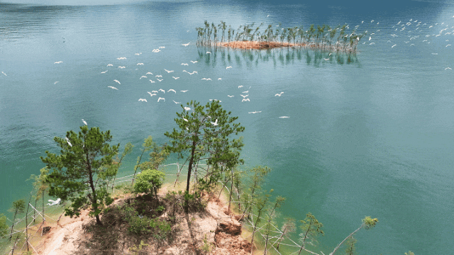 游客登船后,可欣赏到沿湖蜿蜒9公里的亲水栈道,以及光头岛、猴岛、亲子岛等岛屿如翡翠般点缀湖面。其中,白鹭岛是航线的核心景观。每年秋季,成群白鹭从北方迁徙而来,在此展翅翱翔、掠水觅食,洁白的身影与青山碧水相映成趣,构成“一行白鹭上青天”的动人画卷,成为流溪河国家森林公园“流动的生态名片”。
