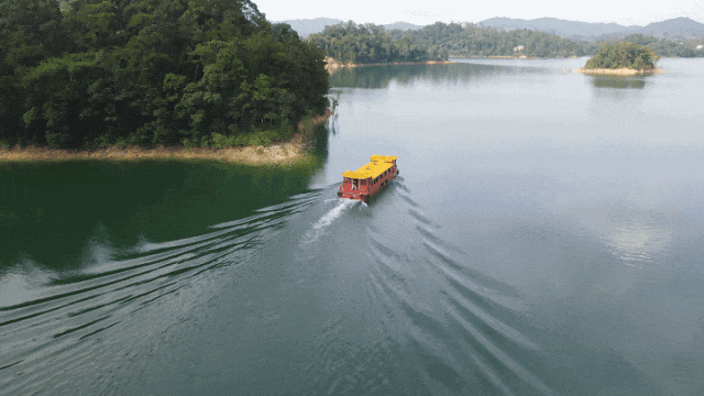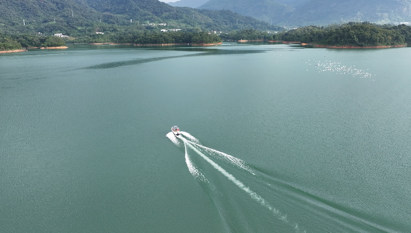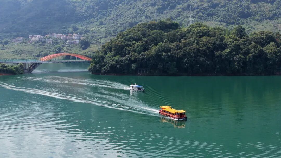 航线延伸至开阔水域,远眺形似卧牛的黄牛山轮廓分明,而沿途的流溪河水库大坝更显雄伟,这座大坝集防洪、灌溉、发电与旅游等综合功能于一体,实现了生态之美与工程之力的完美融合。