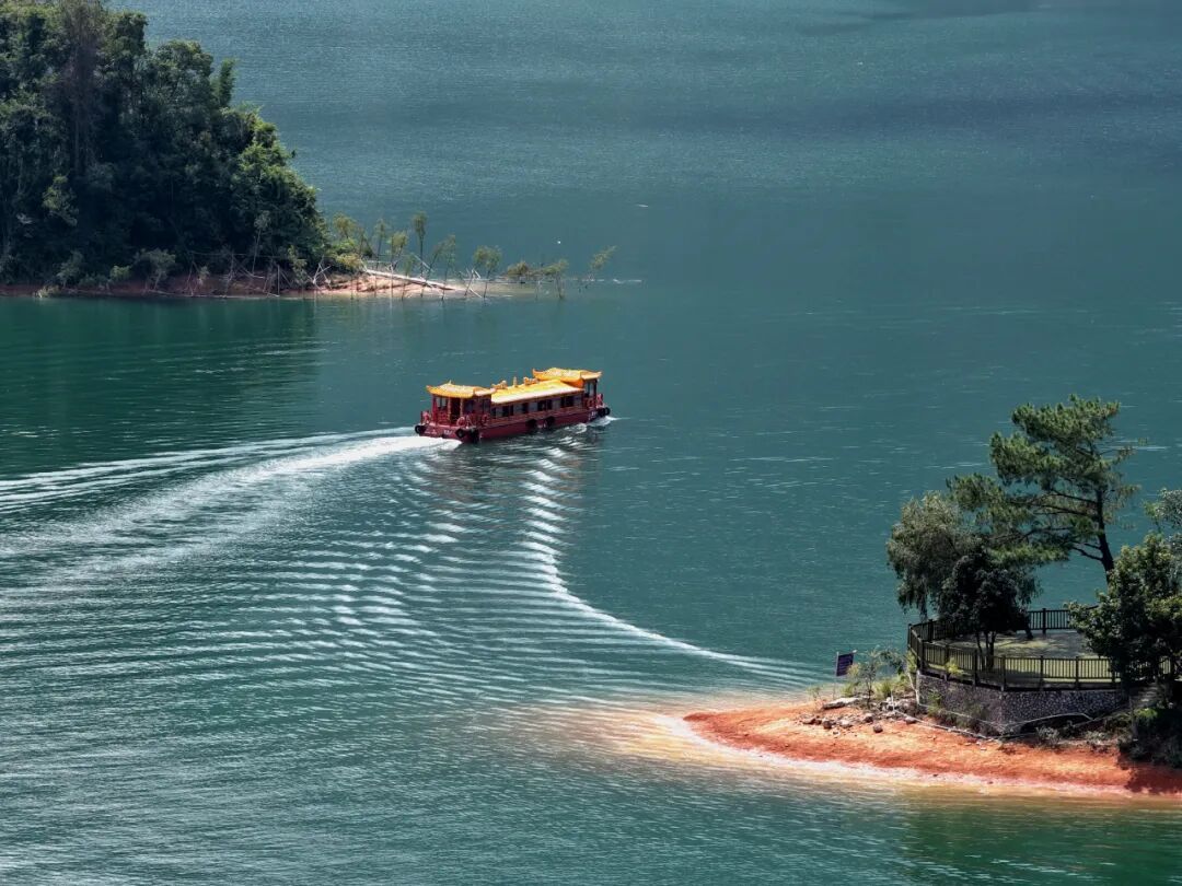 游船航线从公园码头启航,全程约30分钟,沿途景观层次丰富。航线串联起流溪湖的核心美景:13.39平方公里的清澈水域碧波荡漾,如一块巨大的翡翠;原生态的岸线林木葱茏,构成天然的绿色长廊;22座大小岛屿如明珠般散落湖中,船行其间,步步皆景。