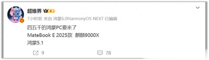 据数码博主超维界透露:四五千的鸿蒙PC要来了 ,MateBook E 2025款 麒麟9000X ,鸿蒙5.1